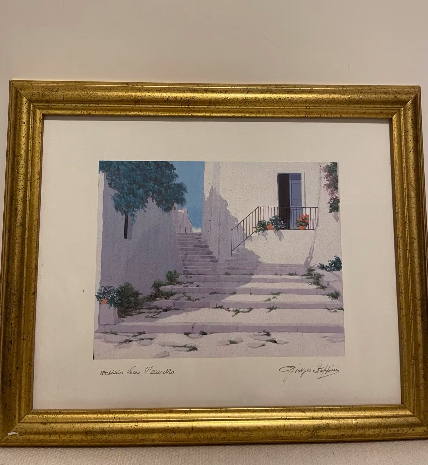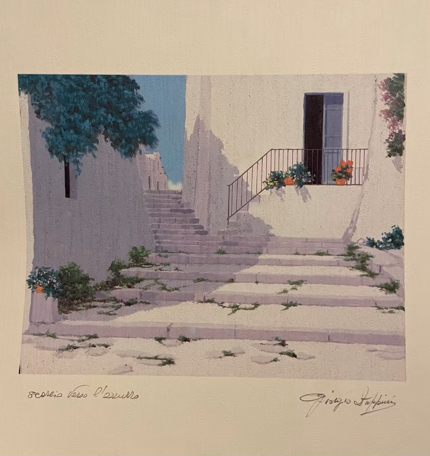 “Scorcio verso l’azzurro” av Giorgio Zuppini er et stemningsfullt motiv som fanger essensen av det italienske Middelhavet. Komposisjonen leder betrakteren opp en rolig steintrapp, omgitt av hvitkalkede vegger, grønne planter og varme soltoner – før blikket åpner seg mot det blå i horisonten.